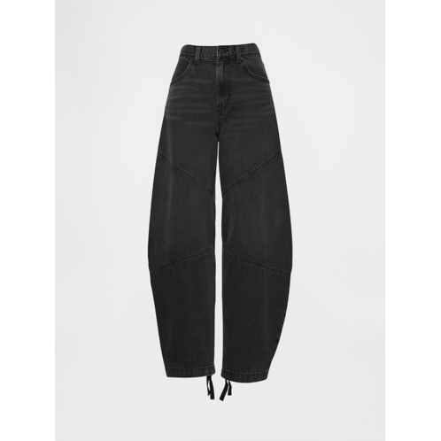 -Fit:An ankle-length horseshoe jean that's fitted at the waist with an exaggerated curved leg and tapered ankle.