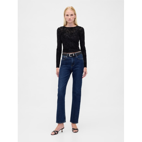- Soft sheer top with burnout velvet detailing. In a slightly cropped fit.
