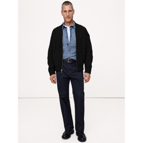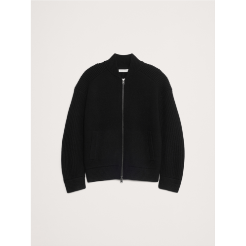 - We borrowed design details from the classic bomber jacket for this zip-up sweater, selecting ribbed stitches to create panels at the shoulders and arms. Here, we selected one of our favorite Merino wool blends, which we love for its ability to add warmth without adding too much weight.