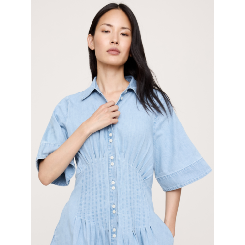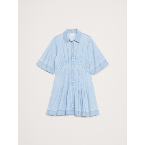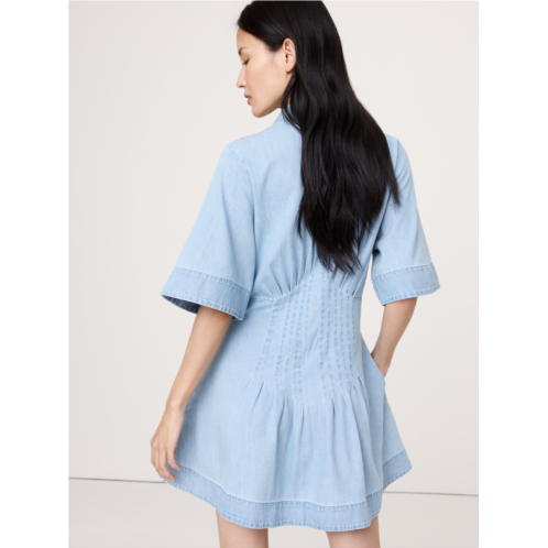 - Deconstructed, reconstructed. This mini dress nods at the season's drop-waist trend with corset-inspired pleats at the waistin lightweight 100% cotton denim.