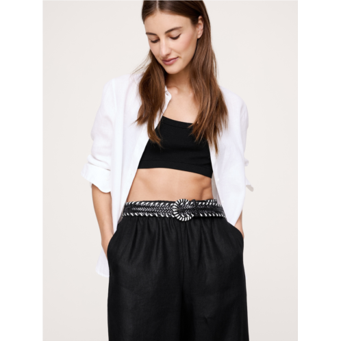 - A classic braided leather belt with contrasting whipstitch leather accents and a wrapped leather buckle.