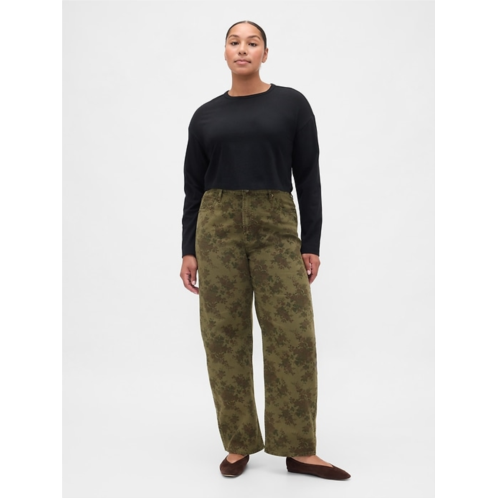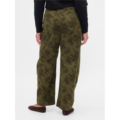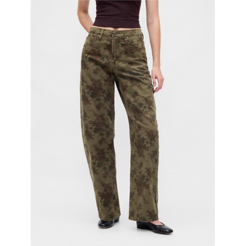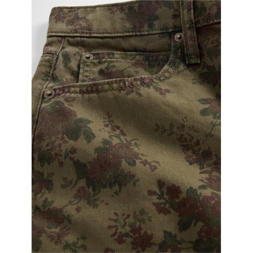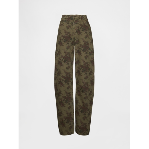 -Look:A five-pocket barrel jean in an olive green floral print.