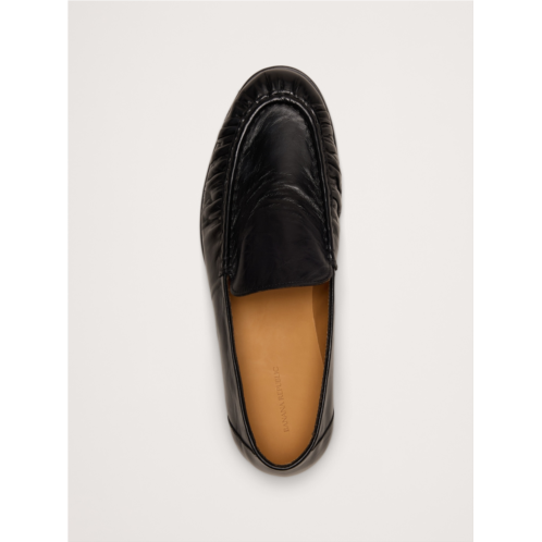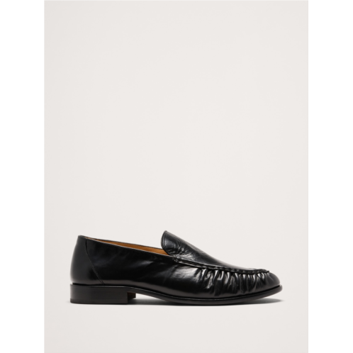 - A sleek loafer with moc-toe construction in luxurious leather.