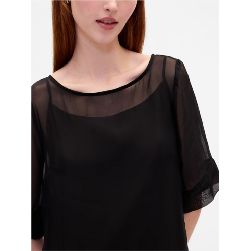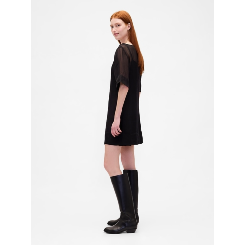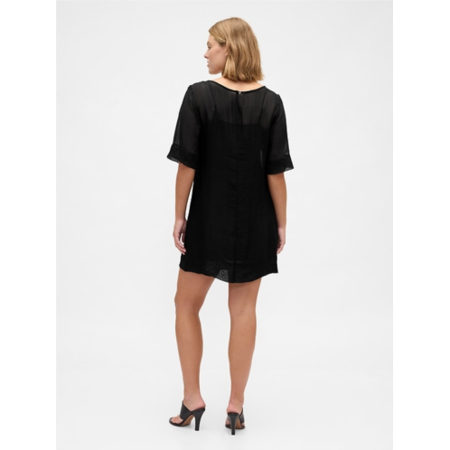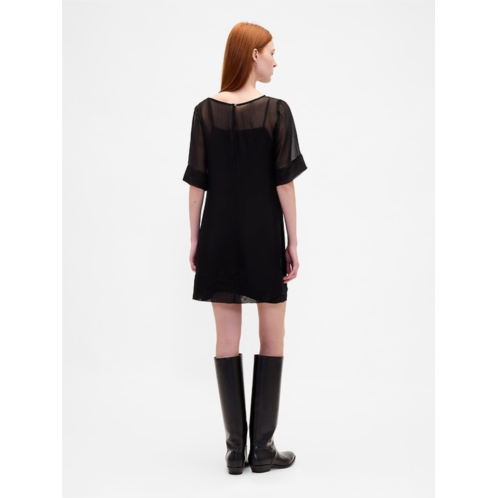- Soft, sheer organza mini shift dress with a removable cami lining.