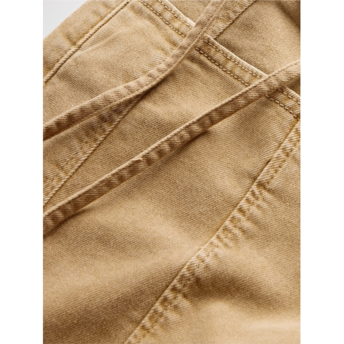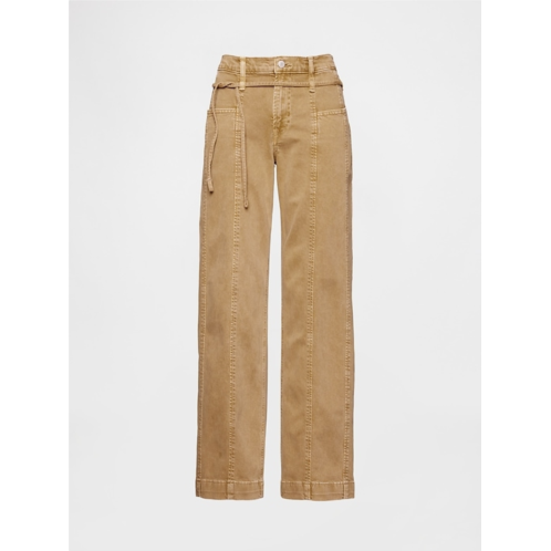 -Details:Zip fly, button closure, front and back patch pockets, front seams, & self-tie micro belt with separate loops below waistband.