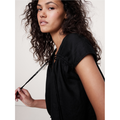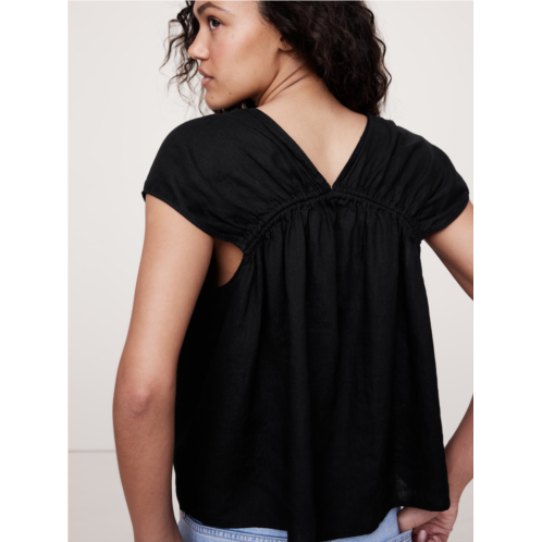 - An easy button-front top, in 100% certified-European linen. We added drawstring accents at the shoulders to create a flowing, trapeze shape through the body.