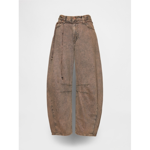 -Fit:An ankle-length horseshoe jean that's fitted at the waist with an exaggerated curved leg and tapered ankle.