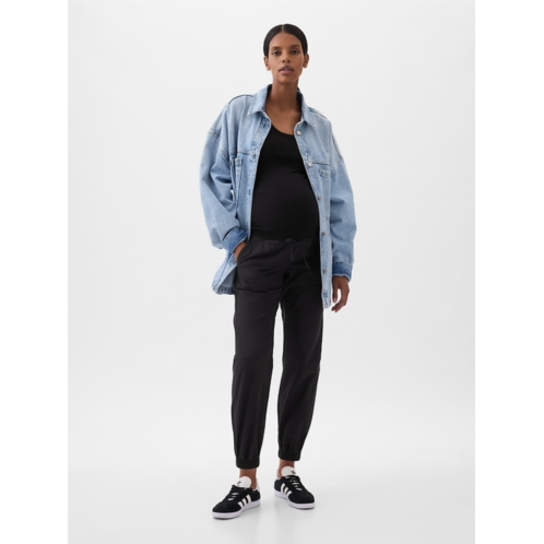 - Elasticized waist with drawcords and full ribbed panel for over-belly comfort.