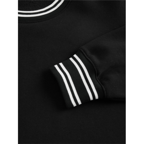 - Long sleeves with drop shoulders and striped rib cuffs.
