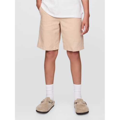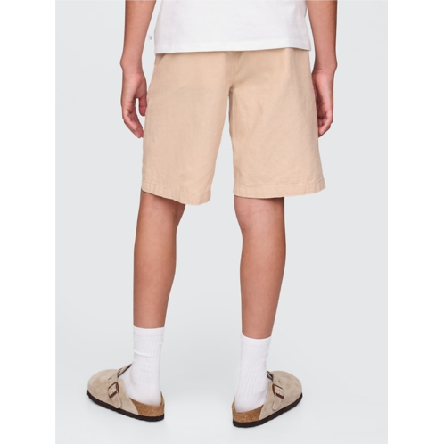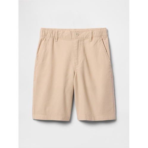 - Elasticized waist with inner drawcords; button closure, zip fly.
