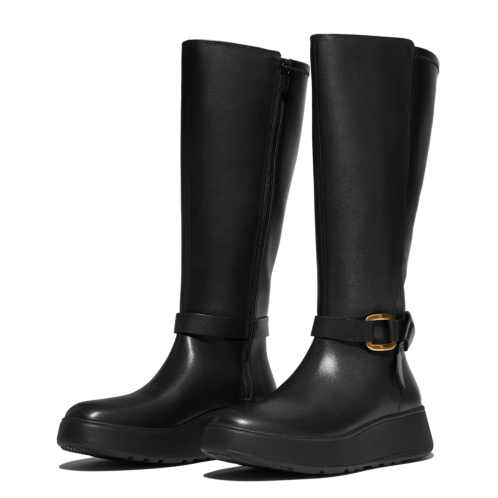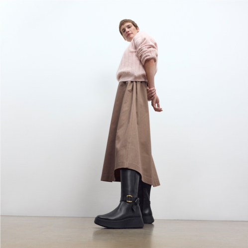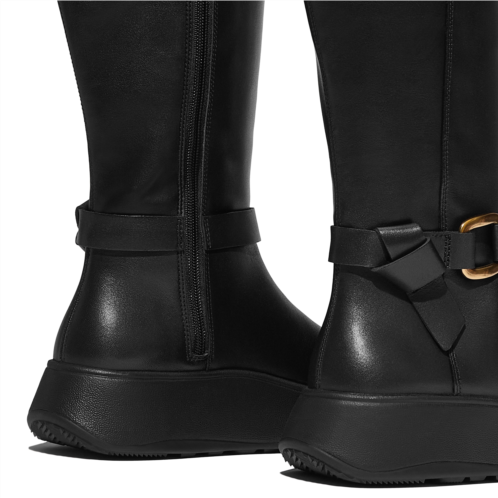 These tall stacked boots uplift almost any outfit - effortlessly. Crafted with premium leather uppers for durability and timeless style, and finished with bold square-ring hardware for a modern edge. Stretch faux leather at the back creates a sleek, contoured fit, while a full inside zip makes for easy on/off. Set on a flatform version of our Microwobbleboard midsole for all-day comfort (and a subtle height boost). Whether at work or off-duty, they’re the kind of boots you’ll reach for again and again.