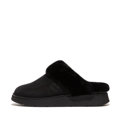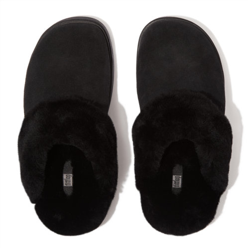 These light plush slip-ons bring a luxe modern edge to the classic fuzzy slipper. A sleek one-piece suede upper, edged in a wide warm shearling collar, is set on a chunky sole.