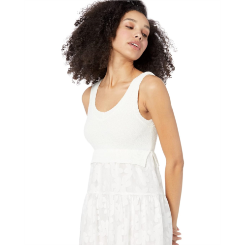 Textured bodice with V-neck, sleeveless construction, and ribbed hem.