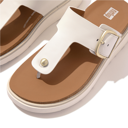 Our next-generation sandals bring a luxe modern edge (and our ultra-cushioning tech) to the classic T-bar toe-post sandal. Boasting a directional chunky sole and simple soft-leather strap, with a domed stud at the front. A curvy brushed-metal buckle gives a customized fit. While minimal stitching, leather welt sole detail, and leather linings add to the refinement. On a light clean-look version of our triple-density Microwobbleboard midsole, engineered for pressure diffusion, impact reduction, and long lasting cushion. Here molded with a cork rim, for extra style and more use of natural materials, while keeping the light soft trademark feel. Grippy rubber pods on the bottom make these suited to country paths/light trails. Beautifully crafted, ergonomically comfortable sandals you'll want to wear every day, everywhere. Metal hardware is 100% recycled zinc. The Microwobbleboard tech on these is 80% EVA foam/20% cork. Note: Available in women's and men's versions.