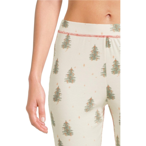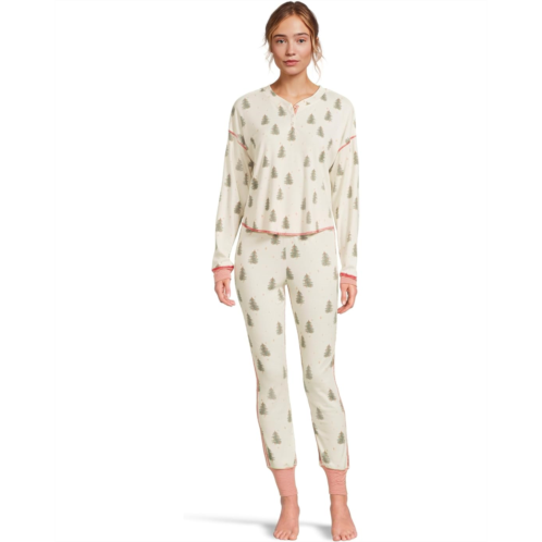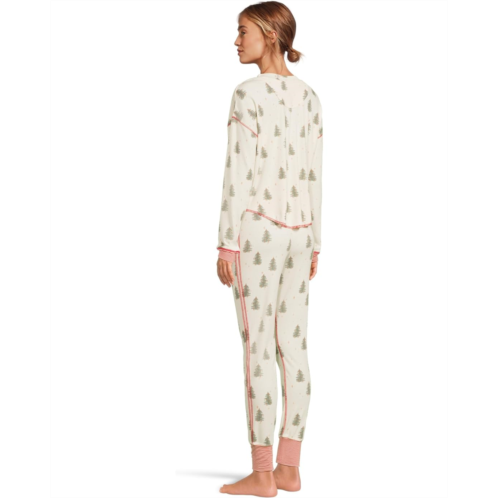 A long sleeve henley crewneck paired with high rise joggers in a stretchy, ribbed jersey fabric. With allover print, you'll be ready for a day of lounging or a restful evening.