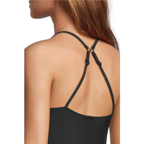A sleek little one-piece is always the right answer. This one piece is perfect for lying by the pool or diving in-you'll want to take this bad boy on every summer trip. featuring a double crossback, adjustable straps, and a low v-neck. other features include a hidden shelf bra with picot elastic, removable cups, a j-hook that enables the straps to convert to a crossback, and matching lining.