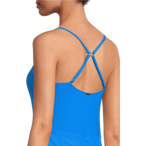 A sleek little one-piece is always the right answer. This one piece is perfect for lying by the pool or diving in-you'll want to take this bad boy on every summer trip. featuring a double crossback, adjustable straps, and a low v-neck. other features include a hidden shelf bra with picot elastic, removable cups, a j-hook that enables the straps to convert to a crossback, and matching lining.