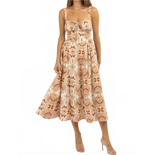 Just add slides or mules and you are good to go.The Terra Midi Dress by Moon River is a boho chic masterpiece perfect for a summer vacation. Crafted from 100% cotton, this sleeveless dress features a flattering corset bodice with a sweetheart neckline and a geometric pattern that enhances its A-line silhouette. Its midi length and front tie detail bring elegance, while the back zippered closure ensures a secure fit. Model Naomie is wearing a size XS and stands at 5'8', dress size 2.