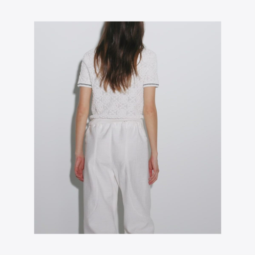 - Crochet detail at front collar, placket, and sleeve cuffs