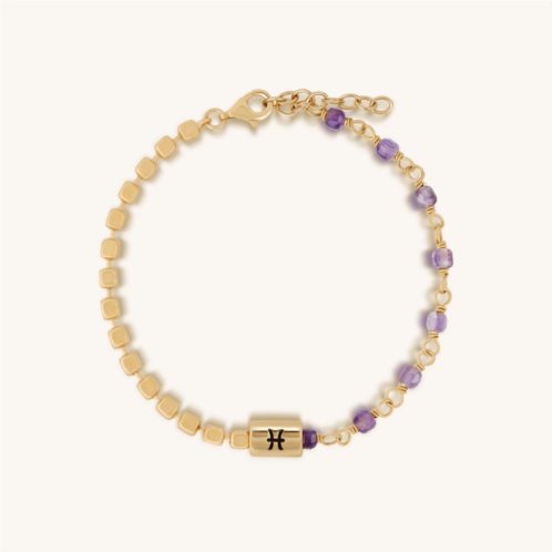 If you increase your compassion for yourself, it reverberates outwards to all those around you. For the imaginative Pisces who leads with their heart, the use of empathy to guide them towards connections is their ultimate joy in the world. For this dreamer of the Zodiac, we have handcrafted the “Intuitive Dreamer Pisces Amethyst Bracelet”. Show off your Pisces pride with 10 gorgeous Amethyst beads adorning the gold chain and a Pisces symbol on this stunning bracelet.Size - 6.5' + 1'Charm Size - 6 x 8 mmHigh Polished Gold Plated SilverLobster ClaspBall Square Chain 3mmAmethyst - Stress Relief, Health, SerenityHandmade in Thailand