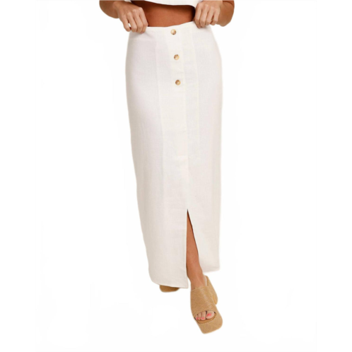 The midi length skirt is here to stay and we especially love this style.Introducing the Winnie Linen Midi Skirt by MOON RIVER, your perfect summer companion in a chic, minimalist solid white design. This skirt is crafted from an 80% linen and 20% cotton shell, with a polyester lining for added comfort. Closure is secured with a side zipper while showcasing a stylish front button detail. Care for this elegant piece by hand washing in cold water, laying it flat to dry, and using a low iron if needed.