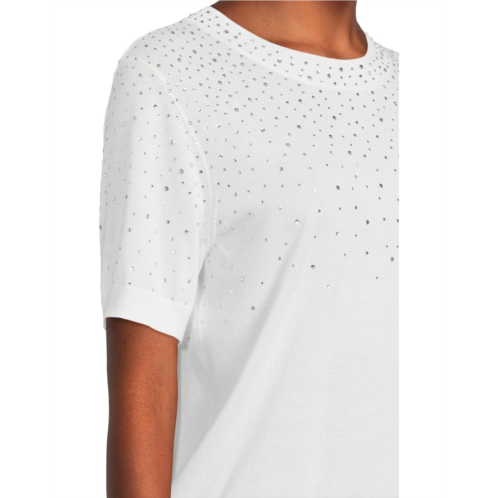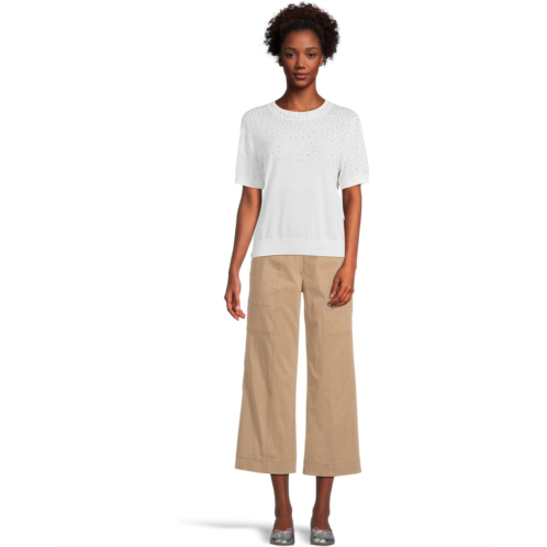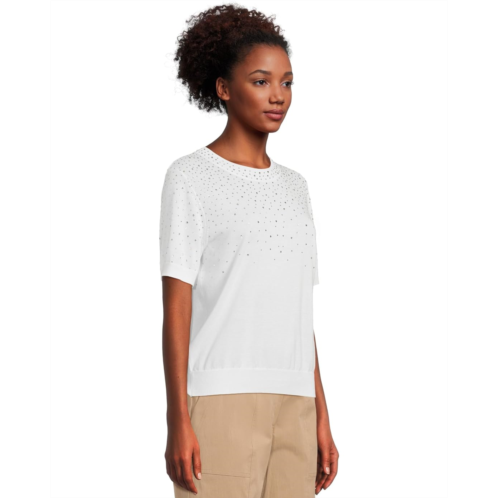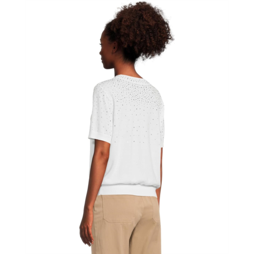 Add a touch of charm to your wardrobe choosing the Elliott Lauren Cotton Charm Short Sleeve sweater. This stylish piece features a crew neckline, short sleeves, and a straight hem for a flattering fit. The ribbed collar, cuffs, and hem provide a polished finish, while the crystal detail adds a touch of sparkle.