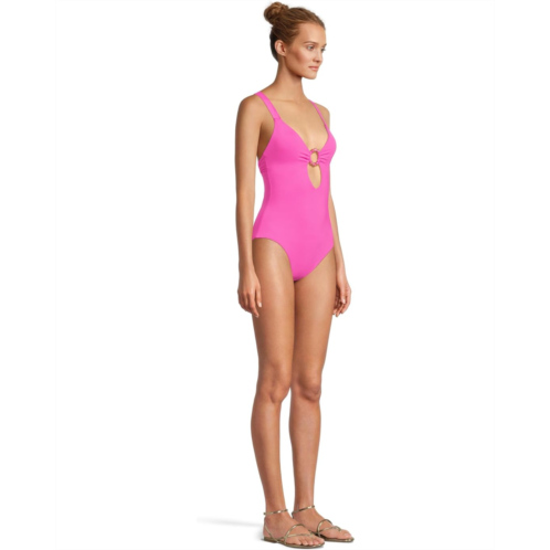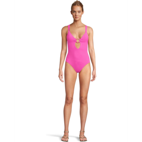Swim strong and look attractive wearing the BECCA Marble Canyon Ariyah Ring One Piece. Featuring plunge neckline, crisscross back with tie closure, sleeveless style, gold ring with dyed to match marbleized stones, and removable cups.