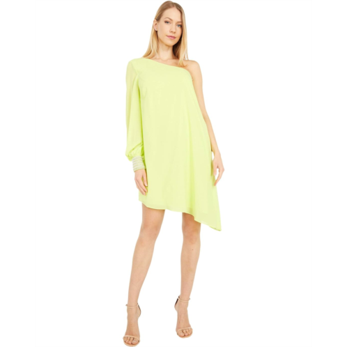 - Short dress flaunts an asymmetrical neckline and a long sleeve, one-shoulder design.