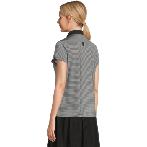 Crafted from a lightweight and breathable Cooltrex performance fabric with stretch, the Jamie Sadock Striped Short Sleeve Top adds comfort to your casual lifestyle. The pull-on style top features a traditional polo self-collar, short sleeves, a hidden zipper placket, an allover striped print, and a straight hem.