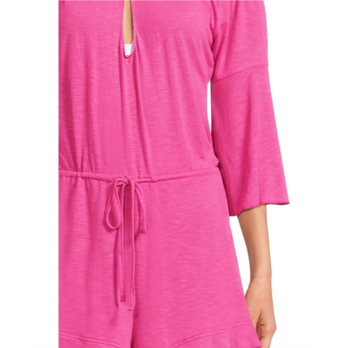 Indulge in art of elegance wearing the BECCA Breezy Basics Off The Shoulder Romper Cover-Up. This romper features off-shoulder style, keyhole at front neck, blouson at waist, adjustable tie at waist, standard fit, flounce bell sleeves, and flutter hem on short.