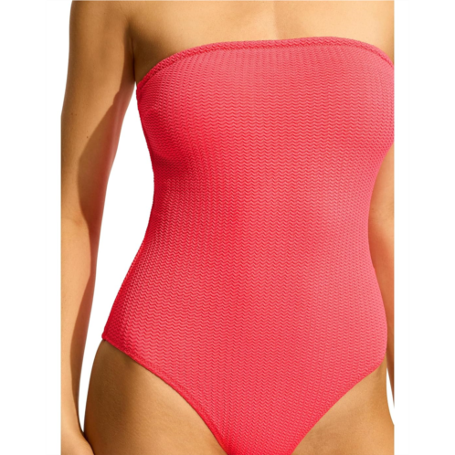 Make a statement at the beach or pool wearing the Seafolly SeaDive Bandeau One-Piece. It features removable cups for customizable shape and support, and an internal shelf bra for added bust support. The regular legline is crafted to flatter the legs, while gripper tape ensures the swimsuit stays perfectly in place. Additionally, it includes a removable strap for the perfect fit and versatile styling options.