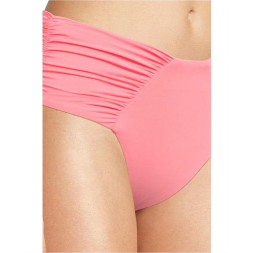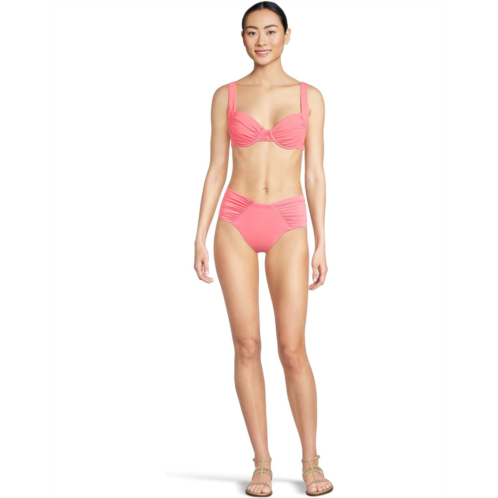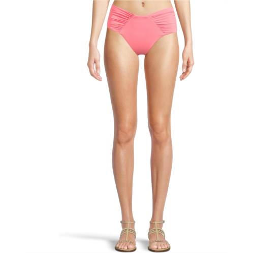 Add comfort to your beachwear look wearing BECCA Color Code Ashlyn French Cut Bottom. The pull-on style bottoms feature a french-cut design, wide soft shirred sides, a high waist high leg, and princess seam shirring.