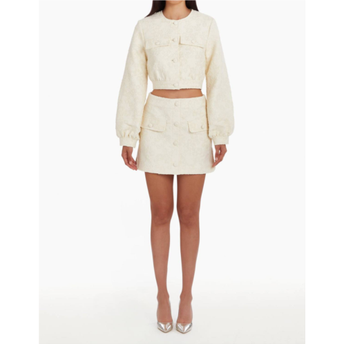 Cute, casual, and comfortable. This jacket is a must have.Discover the Bello Jacket by Amanda Uprichard, a chic and sophisticated choice for your spring wardrobe. Featuring long balloon sleeves and stylish covered button closure, this cropped jacket showcases an intricate jacquard pattern that adds texture and elegance. Crafted from a cotton blend including 46% cotton, 36% polyester, 16% viscose, and 2% spandex, it ensures comfort and style. Care - Dry clean only. Perfect for New Year's Eve or a dinner party, pair it with the Bello Skirt in Muslin for a complete, minimalist look.