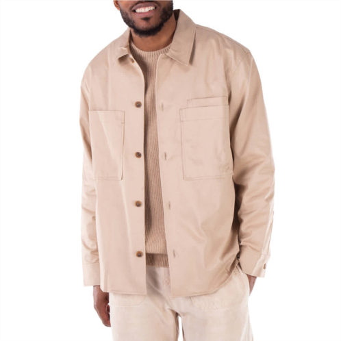 메종키츠네 Maison Kitsune Men's Tops. Fashion category - Casual Button-Downs. SKU - MM00401WW0078-LIGHT BEI. Color - Beige. Maison Kitsune Long-Sleeve Cotton Gabardine Overshirt. This relaxed-fit plain cotton gabardine overshirt features a shirt collar, engraved horn button closure, long sleeves with buttoned straight cuffs, three patch chest pockets, and a tonal embroidered 'Maison Kitsune Handwriting' signature on one pocket. 100% Cotton.
