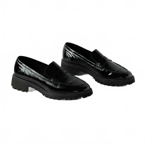A classic loafer that is both comfortable and polished.Introducing the Women's Karina Loafer by Ara, a timeless piece that blends classic style with modern sensibilities. Crafted from sleek black patent leather, these loafers offer an almond toe shape and a comfortable block heel design, perfect for summer vacations. The monochrome trend enhances its versatile appeal, making it a chic addition to any wardrobe. Ideal for adults seeking a stylish yet flat heel option without sacrificing comfort.