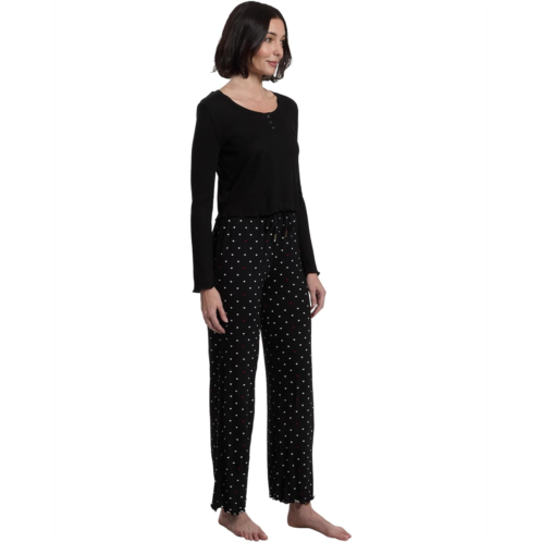 - A long sleeve scoop neck top with a Henley neckline in a soft waffle fabric is paired with a super soft jersey wide leg drawstring pant, embellished with sweet lettuce ruffle edges. Perfect for lounging at home!