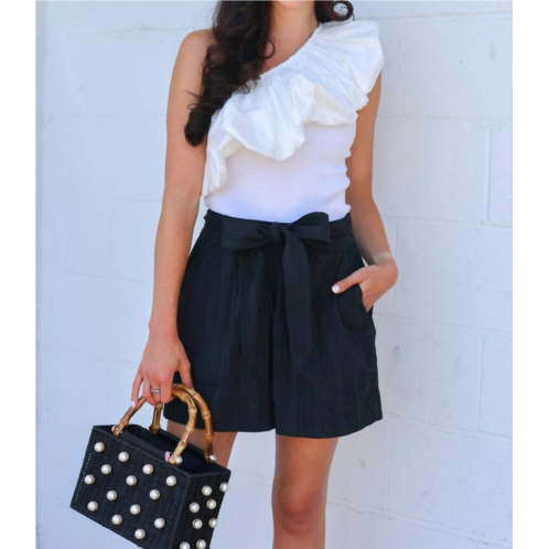 Tuck your favorite tee into these high-waist shorts for a more casual-cool feel.Discover the Marie Oliver Cori Short, an elegant high-waist piece in versatile black featuring a textured cotton blend for refined comfort. This A-line short is designed with flattering pleats and includes an optional tie belt that enhances its sophisticated silhouette. Crafted from 84% cotton, 15% nylon, and 1% spandex, it boasts a side zipper with a hook-and-eye closure. For care, machine wash on a gentle cycle and lay flat to dry.