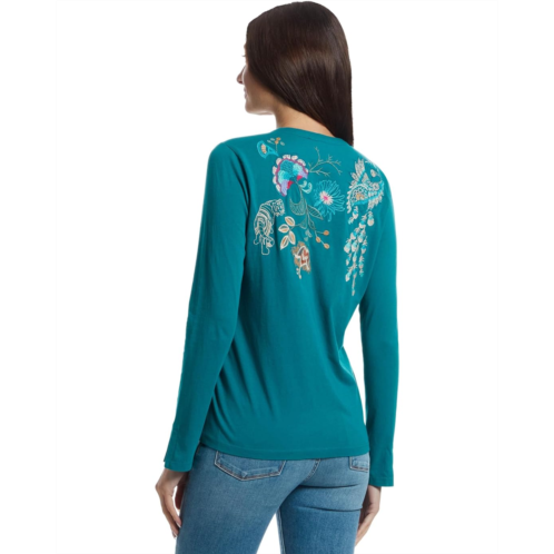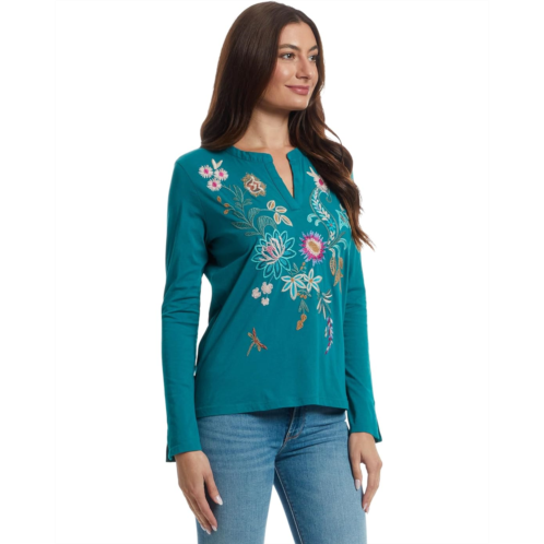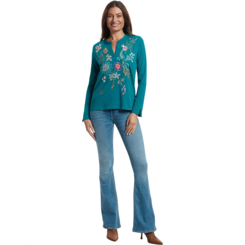 - Bright and playful, the Johnny Was Split Jersey Tee - Edwin blouse comes to life with colorful floral embroidery across the chest and shoulders. This printed top is styled with long sleeves and a straight hem. Its relaxed silhouette and split neckline make it effortlessly easy to wear, bringing a touch of charm to any casual look.
