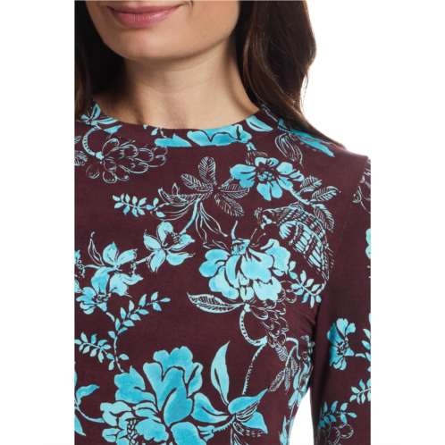 - Fresh and striking, the Johnny Was The Janie Favorite Fitted Long Sleeve Tee- Alexand top pairs a deep burgundy backdrop with vibrant turquoise florals for a bold contrast. This long-sleeve top is designed with a crew neckline and a straight hem. With its easy fit and timeless crew neckline, this printed top is the perfect piece to brighten up everyday style.