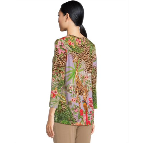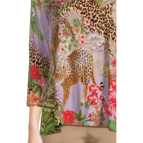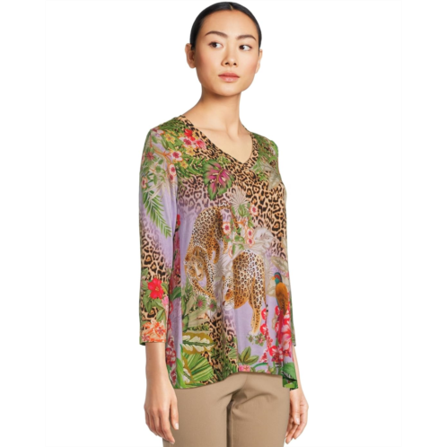 - The Johnny Was The Janie Favorite 3/4 Sleeve V-neck Swing Tee is a bold, statement-making piece that blends comfort with eye-catching style. Featuring a lush jungle-inspired print throughout, it's designed with a gentle V-shaped neckline and three-quarter length sleeves for a flattering silhouette. The soft, drapey fabric offers a relaxed yet polished feel.