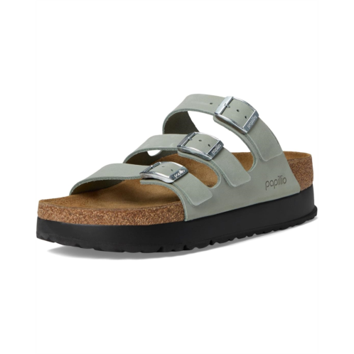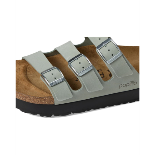 Elevate your fashion altitude with the Birkenstock Papillio by Birkenstock Florida Platform - Nubuck sandals. Unveiling a daring platform sole, this iconic design soars to new heights while embracing its classic roots in luxurious nubuck leather. The contoured cork-latex footbed ensures personalized support, complemented by three adjustable straps featuring metal pin buckles for a perfect fit.