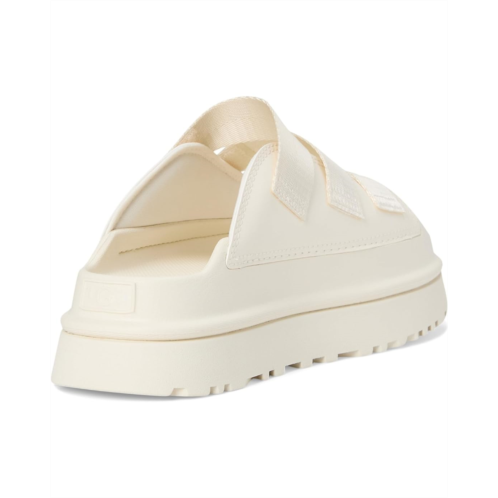 Go ahead, let yourself shine. The UGG GoldenGlow Slide is a versatile sandal with a sunny disposition. The outsole is made with super light and springy sugarcane EVA, it's airy, easy, and bounces back. The upper features three adjustable straps made from recycled fibers, so you can create the perfect fit, whether you're rocking socks or not. The upper lining textile is made with recycled polyester fibers.