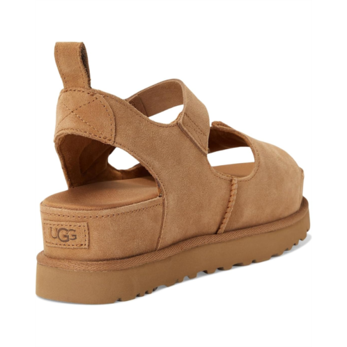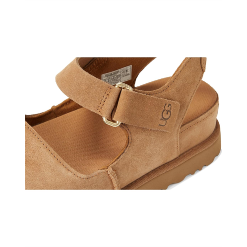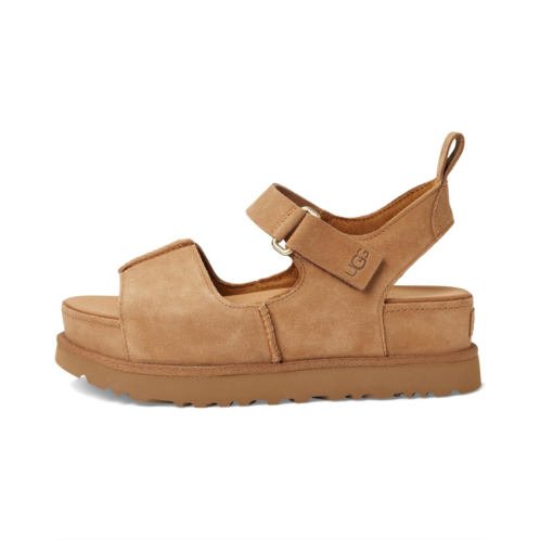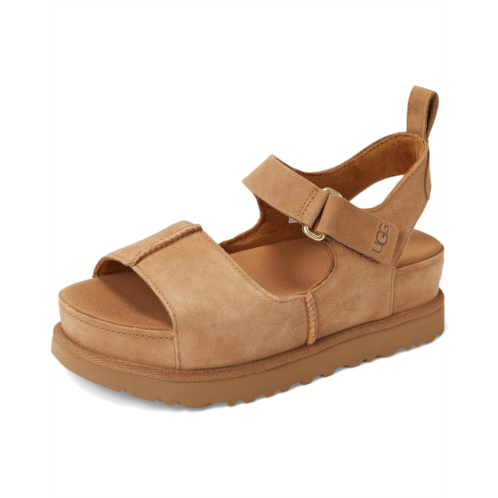 The type of sandal that makes you say, 'we can totally just walk there!' The Goldenstar Hi is the taller sibling to the signature Goldenstar sandal, bringing the same effortless shape to new heights. Pick your outfits and your destinations carefully, because this is an elevated sandal for an elevated moment. This platform is both luxe and comfy, pairing a breathable sockliner with a cushy contoured footbed. Crafted with a soft, suede upper and iconic UGG details, you'll get the same effortless wearability of the Classic Boot, but styled for sunshine.