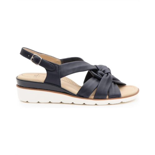 Turn your look into something inspirational with the Lucilla by ara low wedge sandal. Lovely knot detail for added appeal. Easy slip on with an adjustable buckle detail for a custom fit. This style features HighSoft technology. With HighSoft technology, ara has married the feeling of your most comfortable athletic shoes with its pumps, flats and other categories of footwear. Super soft uppers, a highly flexible outsole, a supple and padded insole and a special foam insert hidden under the ball of the foot combine to create an indescribably comfortable walking experience. H fit accomodates medium to wide widths.