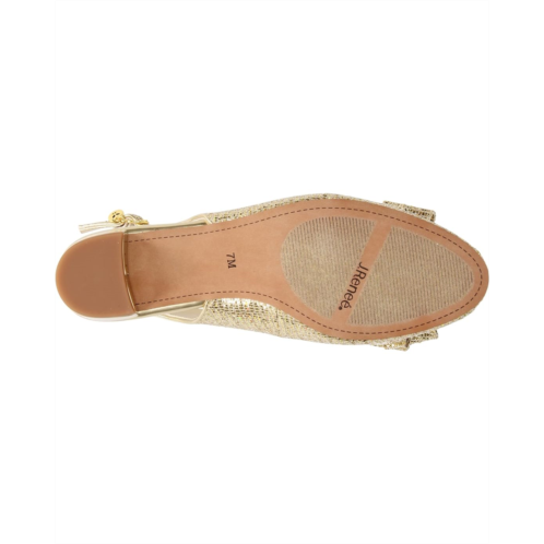 Glittering textile upper with slingback design and huge bow-tie accent on the foot.