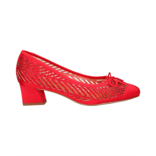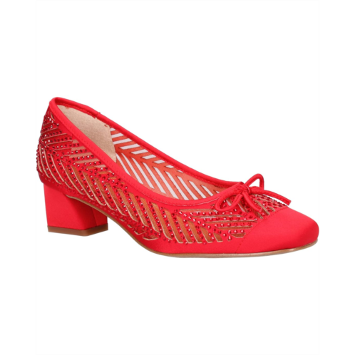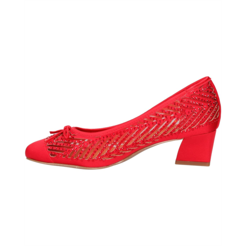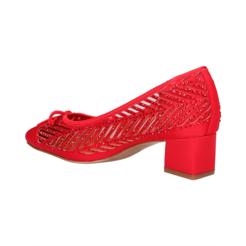 Satin and mesh upper with closed-back design and rhinestone embellishments throughout.