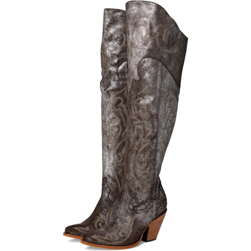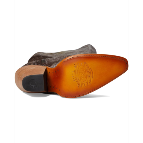 - Funk up your feet wearing the Corral Boots Z5242. Crafted from leather upper, lining, and insole, this pair of lady brown-silver metallized, embroidery, and scrunchable boots features above-the-knee silhouette, pointed toe, cuban heels, side zippered closure and back slit detailing.