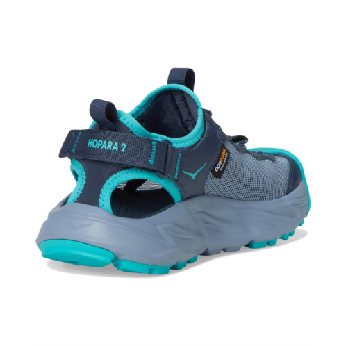 - Geared for your little explorer, the Hoka Kids Hopara 2 tackles mud, dirt, and rocks with amphibian-like ease. Packed with all the cushy comfort and grippy goodness required to keep up with active kiddoes, this quick-dry sandal is sure to make a splash at summer camp. Sporting a kid-friendly toe cap and toggle closure for easy on/off. Featuring round toe, pull tab on tongue, and back, and brand detailing on the sides, and heel counter.