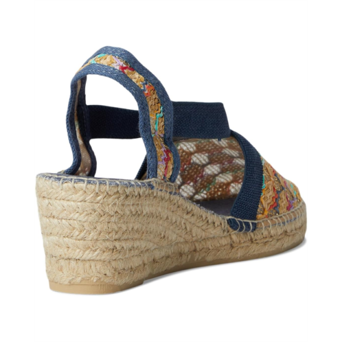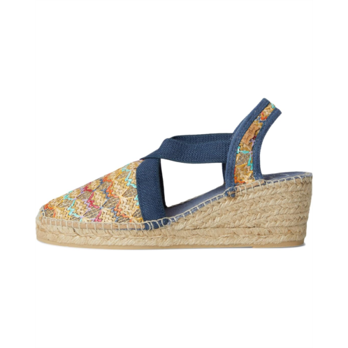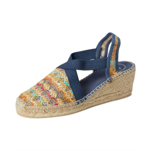 - This Toni Pons Terra-Tt women's espadrille is made of multi-colored woven fabric. The jute wedge sandal has a total height and a platform. The base of the sole is made of non-slip rubber while the inner insole is lined with leather. It has two elasticized bands for a perfect fit to the foot. The union of the fabric and the sole is hand-sewn with cotton thread. This model fits the usual size; if you are between two sizes, we recommend you choose the larger size.