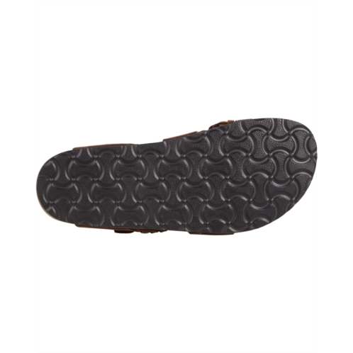 - Leather upper features strap with buckle hardware, braided strap across the vamp, and crossover straps creating a toe loop.